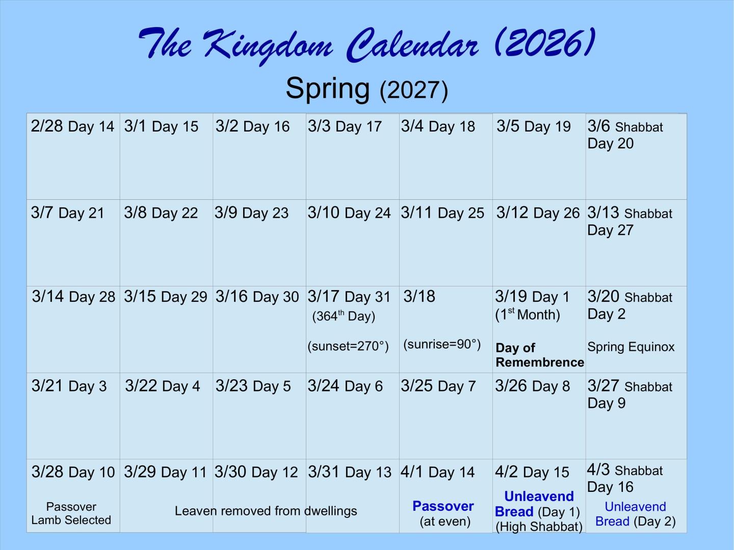 The Kingdom Calendar has been verified to be in complete harmony with the multiple Scriptural calendar related witnesses (specific and implied) that are found in: Genesis; Exodus; Jubilees; Numbers; Leviticus; Deuteronomy; Ezekiel; Daniel; Malachi; Matthew; Mark; Luke; John; Acts; 1 Corinthians; and Revelation (many of these witnesses are shown in “Lost Calendar and Found”, Part 3 of the “In Search of… The Lost Calendar series).